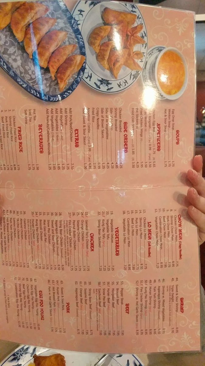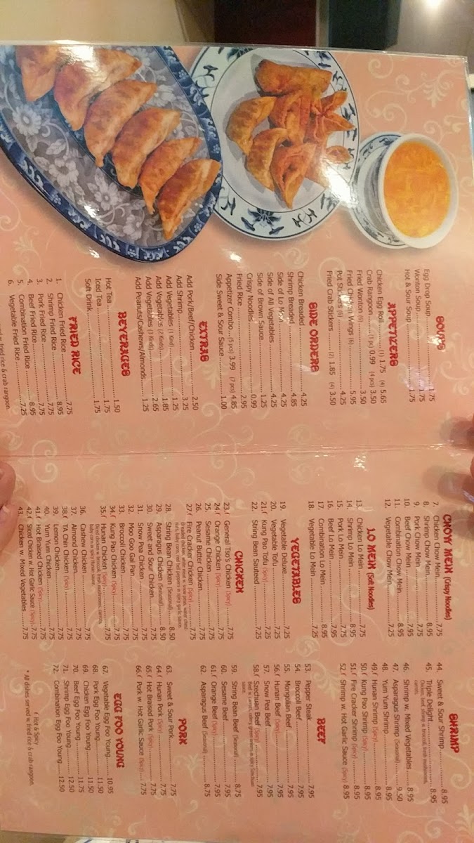 Appetizers such as pot stickers and crab rangoons provide light starters, perfect for sharing, while main dishes like Generals Chicken and shrimp egg foo young bring satisfying flavors and generous portions. The menu also includes side orders like steamed vegetables and crispy noodles, making it easy to customize your meal depending on your appetite or preference.